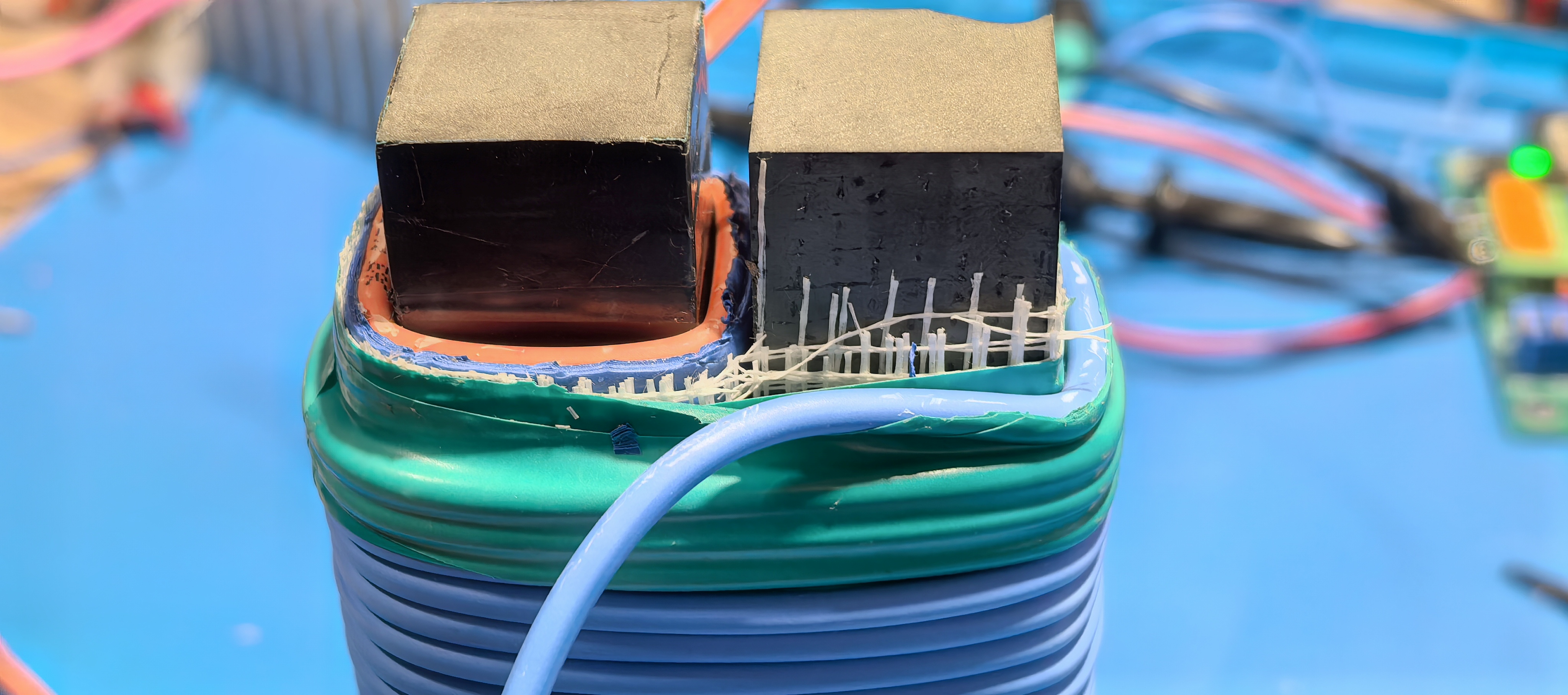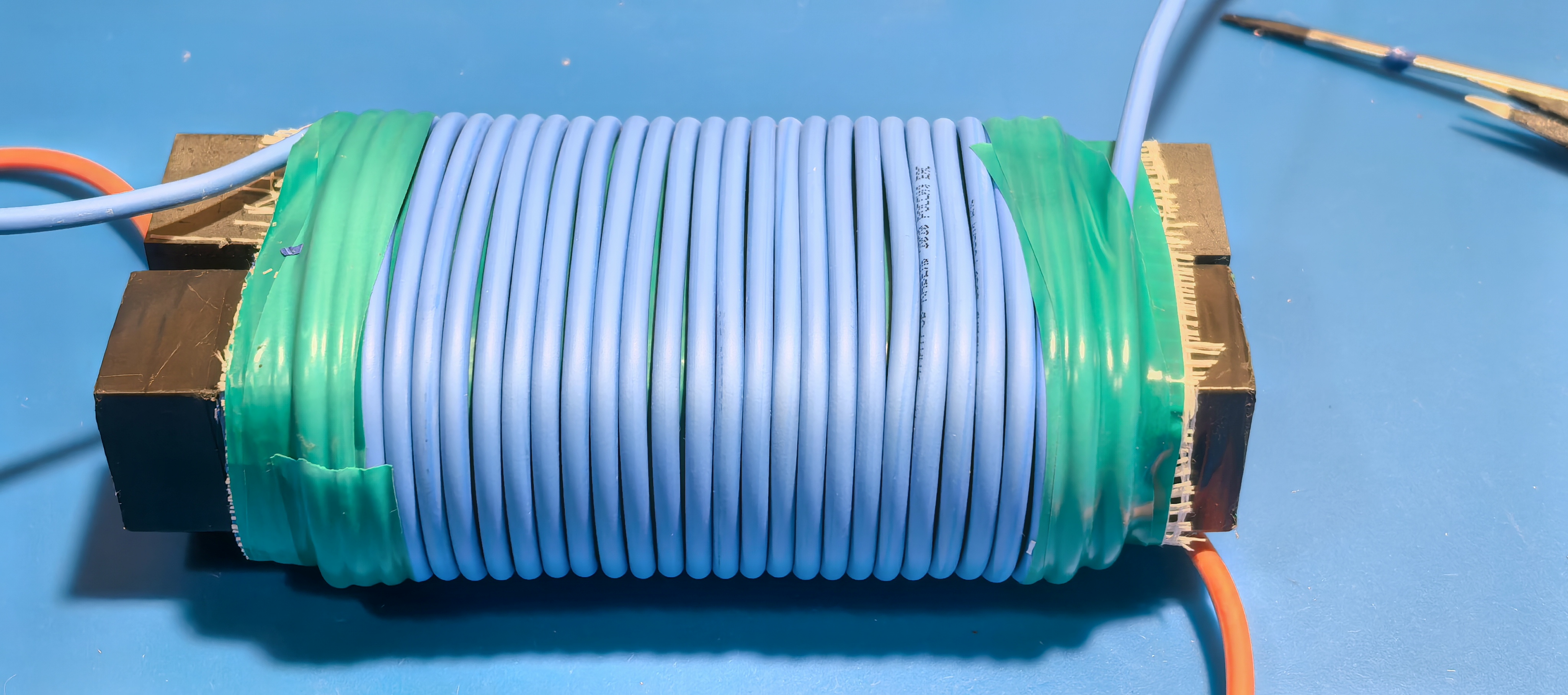 Намотка на двух ферритовых стержнях. Первичная (красный провод) на одном ферритовом стержне. Вторичная, синий провод, намотана вокруг двух ферритовых сердечников. Нагрузка или КЗ на вторичной обмотке оказывает минимальное влияние на ток потребления. Резонанса нет, но частота на которой воздействие вторичной на первичную минимальна либо отсутсвует нужно подбирать.
